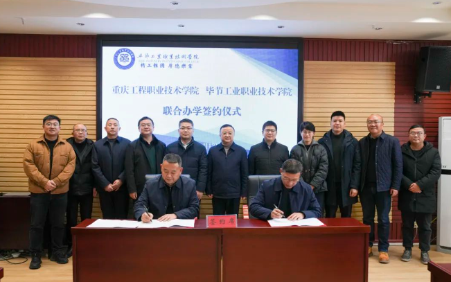 張進在講話中表示,重慶工程職業(yè)技術學院大力支持與畢節(jié)工業(yè)職業(yè)技術學院開展合作,今后將在高水平專業(yè)建設、實習實訓、師資交流、課題聯(lián)合申報、課程體系與教學內容改革、教材共建、學生技能大賽培養(yǎng)等方面與畢節(jié)工業(yè)職業(yè)技術學院開展多元化、全方位的合作,相信通過雙方的共同努力,一定能夠實現(xiàn)校校合作、聯(lián)合辦學目標,為社會培養(yǎng)出更多優(yōu)秀的人才。 李涌表示,希望與重慶工程職業(yè)技術學院開展高水平、多領域、深層次的交流對話,增強雙方在人才培養(yǎng)、教學經驗、課程建設等方面的交流合作,不斷深化合作內涵,形成互補雙贏的戰(zhàn)略合作伙伴關系,進一步鞏固兩校情誼,加深合作關系,優(yōu)化人才培養(yǎng)模式,實現(xiàn)專業(yè)共建、品牌共建、人才共育的新型聯(lián)合辦學模式,共同推動兩校高質量發(fā)展。 邱國援表示,將持續(xù)探索促進兩校高質量發(fā)展的合作模式,進一步提升高素質技能人才培養(yǎng)水平,多方面開展廣泛合作,建立互利共贏合作機制,實現(xiàn)資源共享、共同進步,為社會輸送更多高技能人才,打造優(yōu)質聯(lián)合辦學、校校合作典范。 會后,在參會人員的見證下,兩校簽定了《重慶工程職業(yè)技術學院 畢節(jié)工業(yè)職業(yè)技術學院校校合作框架協(xié)議》《重慶工程職業(yè)技術學院 畢節(jié)工業(yè)職業(yè)技術學院聯(lián)合辦學協(xié)議》。