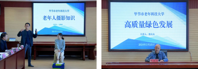 授牌儀式結(jié)束后,市老年科技大學副校長文勁松、市老科學技術(shù)工作者協(xié)會智庫專家曾慶良分別開展了《老年人攝影知識》和《高質(zhì)量綠色發(fā)展》現(xiàn)場授課。